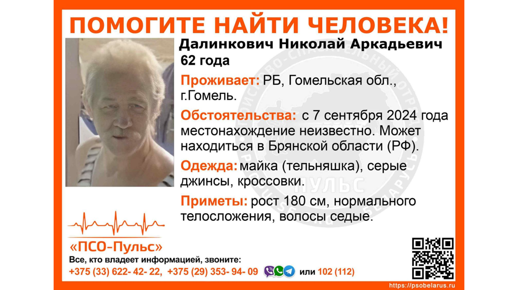 Жителей Брянской области просят подключиться к поискам 62-летнего жителя Гомеля. Об этом сообщает поисково-спасательный отряд «ПСО-Пульс» По словам волонтёров, Николай Далинкович проживал в белорусском городе Гомель. С 7 сентября его местонахождение неизвестно, однако мужчина может находиться в Брянской области. Приметы пропавшего: рост 180 см, нормальное телосложение, седые волосы. Был одет в майку-тельняшку, серые джинсы и кроссовки. Всех, кто что-либо знает о пропавшем, просят звонить по телефонам: +375336224222, +375293539409 или 102. Брянцев просят помочь найти пропавшего 62-летнего Николая Далинковича из Гомеля