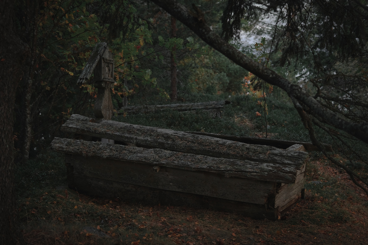 Своих мертвецов коренные жители Карелии и сбежавшие в Карельские леса старообрядцы предпочитали хоронить на островах. Могильный остров — словно иной мир, противопоставленный миру людей, миру живому. Добраться летом туда можно было на лодке, а зимой санным путем. Поэтому и основной транспорт для провода покойного в мир иной — это лодка и сани. На кладбищах ничего нельзя было трогать: будь это хоть ствол повалившегося дерева, хоть покосившийся крест. Темные ельники и сосновые боры островов-кладбищ считались священными. Нам довелось побывать на одном из таких островных кладбищ Карелии, где многовековые деревья, словно стражи- великаны, по сей день скрывают от посторонних глаз домовины и голбецы забытого старообрядческого кладбища. Остроносая деревянная лодка, любезно предоставленная местным жителем, ткнулась в высокий каменистый берег. Лёгкий всплеск воды, и - звенящая тишь. Пар изо рта в ледяном воздухе. Последние лучи заходящего солнца. Сумерки. Утопая в мягких мхах, взобрались по кру