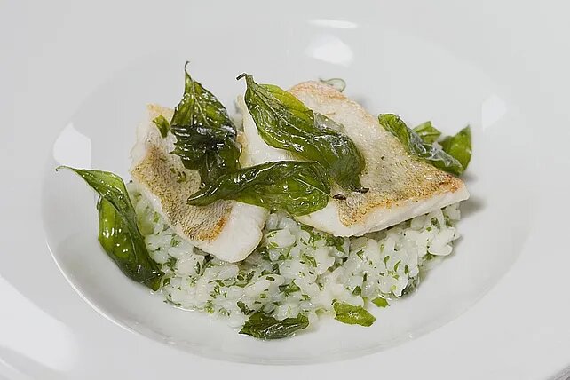 выложите ризотто на глубокую тарелку, сверху или сбоку выложите рыбу и украсьте жареным базиликом.