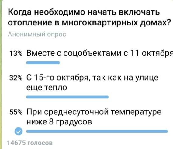 Жители Ростова высказались против идеи раннего включения отопления в жилье. Голосование организовал в своем Telegram-канале глава администрации донской столицы Алексей Логвиненко. Ранее он сообщил, что по итогам заседания штаба по подготовке к отопительному периоду было принято решение с 11 октября приступить к пуску тепла в соцобъекты города: детские сады, школы, поликлиники и больницы. Что касается жилья, то глава предложил горожанам проголосовать на его страничке, ответив на один из трех пунктов. «Сделаем, как решит большинство жителей», — заверил Логвиненко. Голосование продлится до конца сегодняшнего дня. Но уже ясно, что победила идея включить отопление тогда, когда станет реально прохладно.