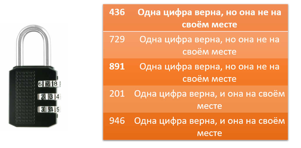 Эту задачу я не отношу к сложным. Не вот прям сложная-сложная... Но она интересная. Мне очень нравятся такие задачи.Здесь уже анализ, здесь уже сравнения, версии, выводы. Лично я редко решаю задачи в уме. Иногда, когда задача очень интересная и не даёт покоя, тогда я в уме начинаю чертить. Но, как говорил мой ротный: "Лучше иметь тупой карандаш, чем острую память". А я привык доверять старшим. У замка трёхзначный код. Будут у нас задачи и четырёхзначными числами, но и эту задачу решать интересно. Всем удачи. Жду ответов.