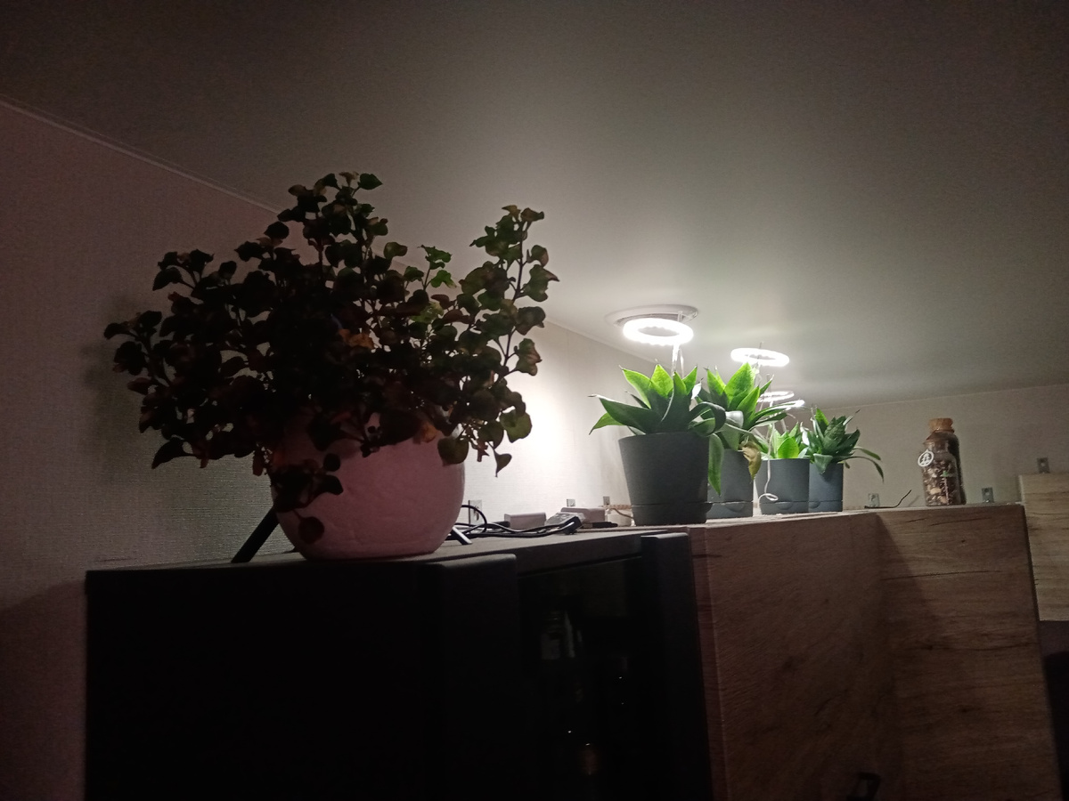 Листая ленту, заметила, что у многих осень из золотисто-приятной, солнечной и относительно тёплой одним днём резко перешла на стадию "унылой поры". Так случилось и у нас. Прошел затяжной дождь, смыл остатки тепла, теперь днем +5. Ночью... под одеялом хорошо. Но комнатные растения с лоджии пришлось занести в квартиру из-за похолодания. И это стало первой небольшой трудностью - разместить разросшиеся за лето растюхи в квартире с тремя котами. На подоконниках съедят. Так что все верхние полочки теперь заняты, и жду с вайлдберрис еще одну - подвесную, на оконную створку. А пока как-то так: Некоторые из них, для которых организовала досветку, останутся на зиму так. Особый восторг у меня и Димки (старший ребенок) вызвали круглые светодиодные лампы с первого фото над низкорослыми сансевьерами. Пока сложно сказать, насколько они эффективны и долговечны, но выглядят просто волшебно. Димка теперь называет сансы - "наши ангелочки". Из-за схожести с нимбом над растюхами. Следующая сложность, кот