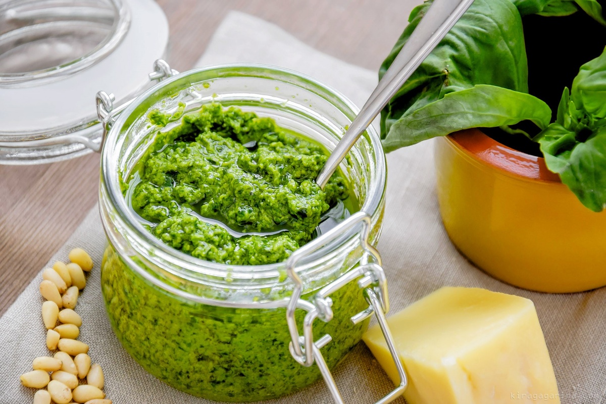 Соус песто - это классический итальянский соус, который известен своим неповторимым вкусом и ароматом. Этот соус имеет ярко-зеленый цвет и обладает свежим и насыщенным вкусом благодаря основному ингредиенту - базилику. Ингредиенты: - 2 пучка свежего базилика - 1/2 стакана оливкового масла - 1/2 стакана измельченных грецких орехов (можно заменить на кедровые орехи или миндаль) - 3 зубчика чеснока - 1/2 стакана тертого пармезана - Соль и свежемолотый черный перец по вкусу Инструкции: 1. В кухонном комбайне или блендере соедините базилик, чеснок, оливковое масло и грецкие орехи. Можно также добавить немного соли и перца. 2. Включите блендер и измельчайте все ингредиенты до получения гладкой консистенции. При необходимости можно приостановить процесс и с помощью лопатки сдвинуть ингредиенты с боков стакана блендера для равномерного измельчения. 3. Добавьте тертый пармезан и продолжайте взбивать до того момента, пока все ингредиенты хорошо не смешаются и не образуют кремообразный
