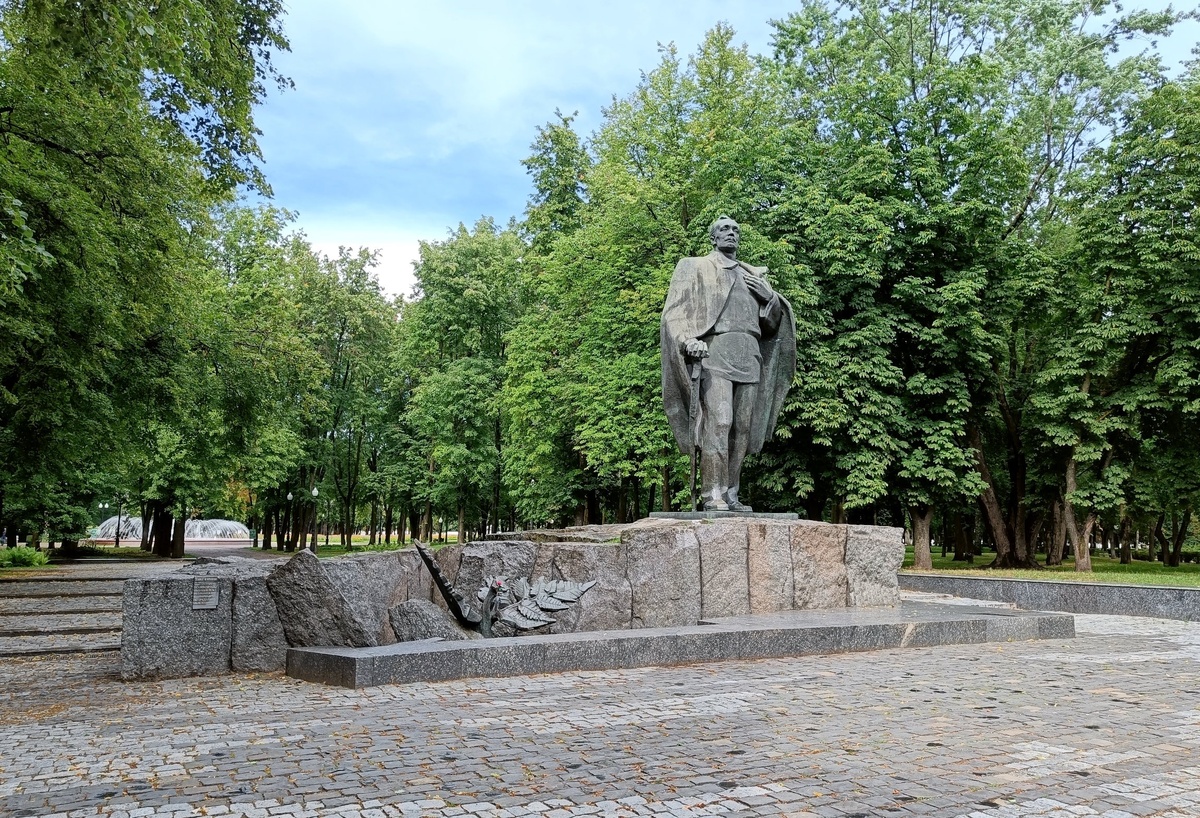 Продолжаем знакомство с Минском. От бывшей электростанции двинемся на северо-запад в сторону Троицкого предместья. В парке имени Янки Купалы нас встречает Янка Купала. Это в домике I съезда РСДРП он жил пару лет, но с 1927 года до начала войны он обосновался в квартале, который был на месте данного парка. Квартал вместе с домом Купалы не пережил войну, как и многие ценные для литературоведов вещи и документы культового поэта. Зато теперь тут есть литературный музей его имени – единственное специально построенное в парке здание.