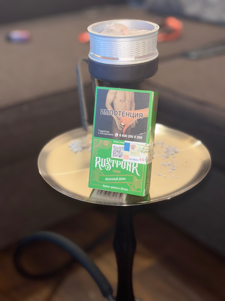 Никотин и Курение вредит вашему здоровью.(18+) И начнем мы пожалуй с текстового обзора на табак от ребят Rustpunk: Яблочный джин🍏🌲 🟢Крепость: Выше среднего. 🟢Сырье: Нет инфы. 🟢Цена: 320 рублей за 40 г. 🟢Жаростойкость: Высокая. Тестил я его на убивашке от Alpha Hookah:Strike. Прогрел табачок на 3х 25 угольках , и немножко упал 😵 Крепость оказалась куда выше , чем было написано на сайте у ребят , первое что я почувствовал это удар крепости мне в легкие. После этого пошел вкус терпкого , травянистого джина с очень сильной нотой можжевельника и легким привкусом кожуры зеленого яблока. В середине прокура яблоко начало вытеснять можжевельник и по ощущениям кальян стал еще более крепким и убийственным 💀 Под конец я докуривал уже чистое зеленое яблоко с легкой ноткой аниса. В целом могу порекомендовать данный вкус тем, кто хочет покурить не сладкий и слегка кисловатый аромат с достаточно высокой крепостью 💪 Данный материал строго для ознакомления. Курение вредит вашему здоровью.