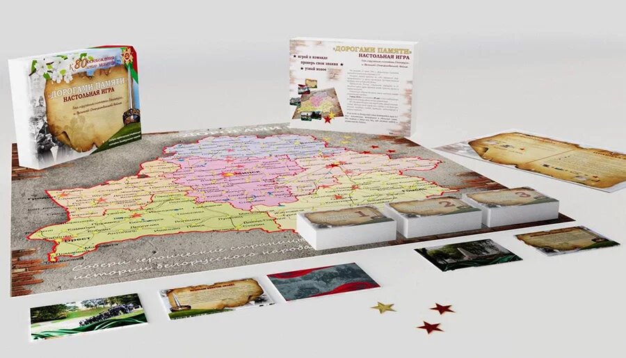 Старший офицер отдела идеологической работы Института пограничной службы Республики Беларусь Вероника Макоед разработала настольную интерактивную игру «Дорогами памяти» для изучения истории Великой Отечественной войны, сообщает корреспондент агентства «Минск-Новости». — Захотелось поработать в команде, научиться чему-то новому. Я выбрала идеологическое направление, так как сама связана с ним. Изначально задумки не было, но очень хотелось сделать что-то полезное для гражданско-патриотического воспитания молодежи, — рассказала девушка. Настольных игр по патриотическому воспитанию немного, поэтому у В. Макоед возникла идея создать такую. Также проект приурочен к 80-летию освобождения Беларуси от немецко-фашистских захватчиков. Он рассчитан как на молодежь, так и на взрослую аудиторию. В игре представлено три вида карточек: фотографии боевых и трагических событий Великой Отечественной войны, фотографии современных мемориалов и карточки с описанием этих мест. Главное игровое поле — современ