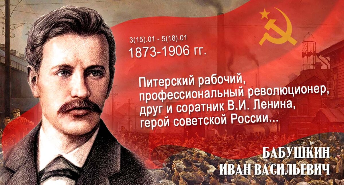 БАБУШКИН Иван Васильевич (15 (3).01.1873 г. – 30 (18).01.1906 г.) – русский профессиональный революционер, большевик-искровец, ученик и ближайший помощник В. И. Ленина, который называл его народным героем, гордостью партии. Организатор и активный участник рабочих кружков в «Союзе борьбы за освобождение рабочего класса». Бабушкин стоял у истоков возникновения пролетарской партии нового типа РСДРП. Известен под партийными псевдонимами Николай Николаевич, Богдан, Новицкая и другими.