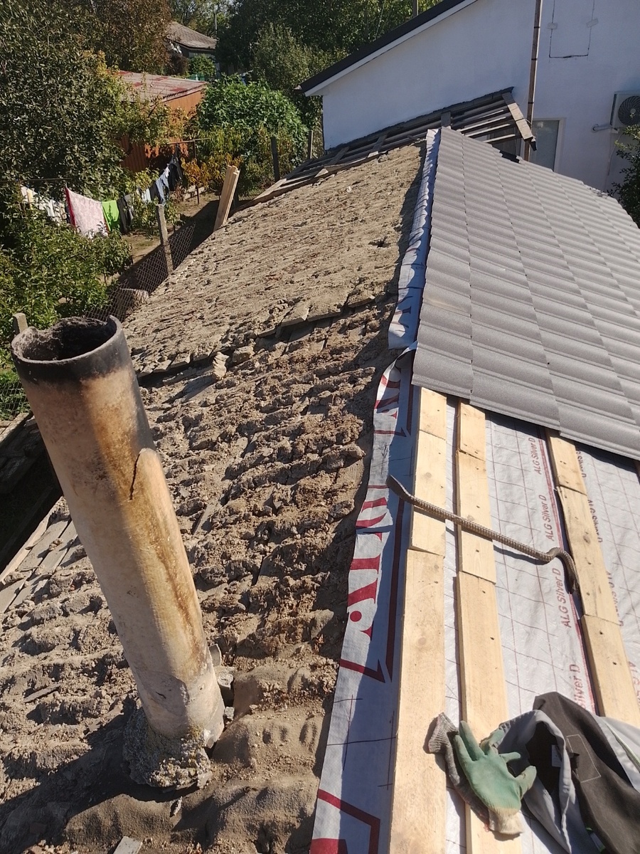 Здравствуйте! Продолжаем в Крымской глубинке переделывать кровлю на хозяйственных постройках. Вот уже и вторая сторона осталась без шифера. На этой стороне глиняная смесь лежит по всей площади здесь нашлась и разгадка, зачем здесь этот слой глины. Правильно Михаил сказал, который Василич, раньше здесь лежала керамическая, глиняная черепица, и именно на вот такую смесь ее укладывали. На удивление, что бы сделать бруски нужно было глину убрать, конечно перфоратор брать не пришлось, но попотеть надо, держится хорошо. Местами остались обломки, по ним и догадались, хотя изначально даже и мысли не возникло, думал онпа на гвоздики крепится, оказывается вот оно как. Заказчикам говорю, вот было бы интересно с такой поработать, хотя бы в руках подержать, старую, натуральную глиняную черепицу, не новодел какой нибудь из шлака, отсева, а именно старую. Коньковых элементов уже много где в Крыму встречал, а вот саму планку нет. Судя по обломкам она легкая, тоненькая. Миллиметра четыре толщи