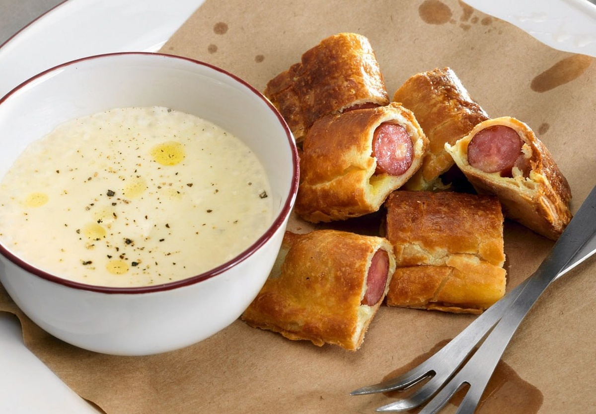 Рецепт Дмитрия Зотова, владельца и шеф-повара ресторана Zotman Pizza ➡️Пошаговый рецепт Ингредиенты: 🟢Копченые сосиски: 12 штук 🟢Дрожжевое слоеное тесто: 300 г 🟢Куриное яйцо: 1 штука 🟢Картофель: 200 г 🟢Лук-шалот: 50 г 🟢Лук-порей: 50 г 🟢Чеснок: 10 г 🟢Сливочное масло: 30 г 🟢Молоко: 100 мл 🟢Сливки 38%-ные: 50 мл 🟢Мускатный орех: 2 г 🟢Соль: по вкусу 🟢Молотый черный перец: по вкусу 🟢Пшеничная мука: щепотка Инструкция приготовления: 1️⃣ Раскатать, подсыпав муки, тесто в лист толщиной 2 мм, нарезать прямоугольниками: меньшая сторона — 6–7 см, а большая — на сантиметр-полтора длиннее сосиски. Завернуть в них сосиски, запечатать, смазать яйцом. Выпекать в духовке десять минут при 180 градусах. 2️⃣ Для картофельного крема произвольным образом нарезать очищенный картофель, шалот и порей, измельчить чеснок, пассеровать в сотейнике на сливочном масле несколько минут. 3️⃣ Залить молоком и сливками, варить до готовности картошки. Добавить соль, перец, тертый мускатный орех. Пробить мас