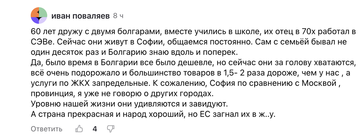 — Было время, когда в Болгарии всё было дешевле, но сейчас они за голову хватаются, всё очень подорожало и большинство товаров в 1,5-2 раза дороже, чем у нас, — пишет читатель.