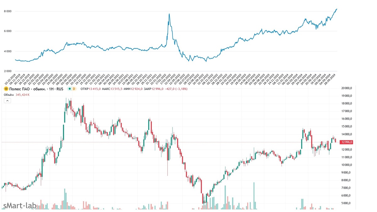 Сначала посмотрим визуально, графики Полюса и золота за 5 лет:
