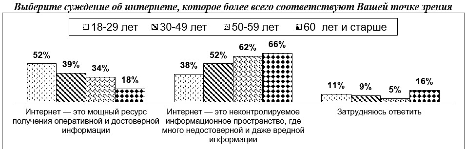 Такая корреляция действительно прослеживается Социологи предложили воронежцам из разных возрастных групп выбрать утверждение, которое будет им ближе всего по духу. Все они касались личного отношения граждан к интернету. Первое звучало так: «Интернет – это мощный ресурс для получения оперативной и достоверной информации» А второе: «Интернет – это неконтролируемое информационное пространство, где много недостоверной и вредной информации» Как показал опрос, чем старше человек, тем чаще он выбирал вариант номером два. Особенно нагляден этот контраст, если сравнивать поколения 18-29 лет и 60 лет и старше. Молодежь в 52% случаев склонялась к первому варианту и в 38% случаев ко второму, а пожилые люди предпочитали первый вариант лишь в 18% случаев, а вот вредоносным его обозначили 66%. Ниже прилагаем график. Чаще других к тому, что интернет приносит больше вреда, чем пользы, склоняются люди от 50 и старше со средним образованием и «бедственным» материальным положением. И наоборот – воронежцы