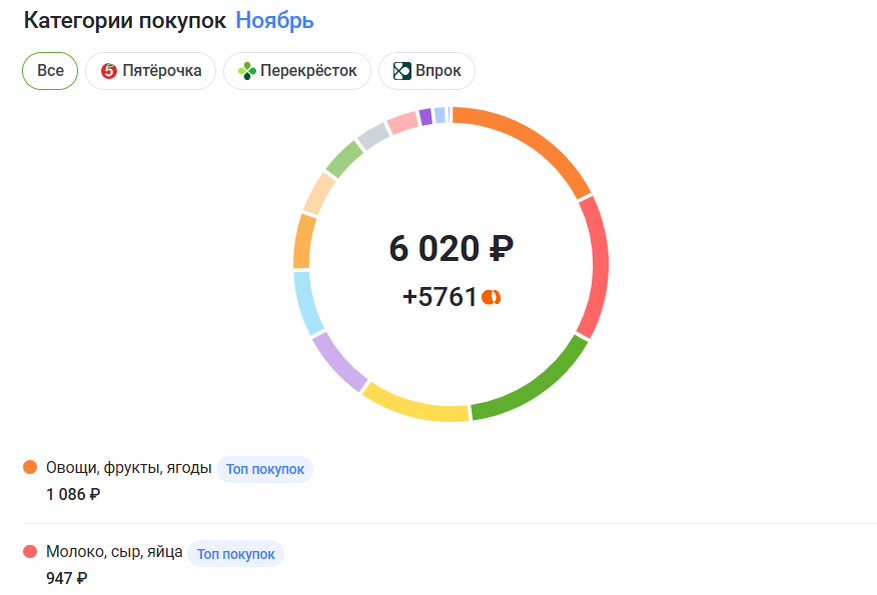 Для меня сейчас Пятерочка самый удобный магазин для регулярных покупок продуктов питания. Я там покупаю не всё, но, если нужно быстро купить недостающий продукт, иду туда. Во-первых, это связано с тем, что в пешей доступности имеется два магазина с ассортиментом, который устраивает меня по цене и качеству. Во-вторых, мне нравится их программа лояльности Апельсин. Я замечаю, что она действительно позволяет накопить баллы и экономить, списывая их на оплату покупок. В среднем получается списать 8 % от чека баллами(апельсинками). Удобно, что апельсинки накапливаются и тратятся и в Пятерочке и в Перекрестке. Только в ноябре в этих сетях было куплено на сумму 6020 ₽ а списано 905 ₽.