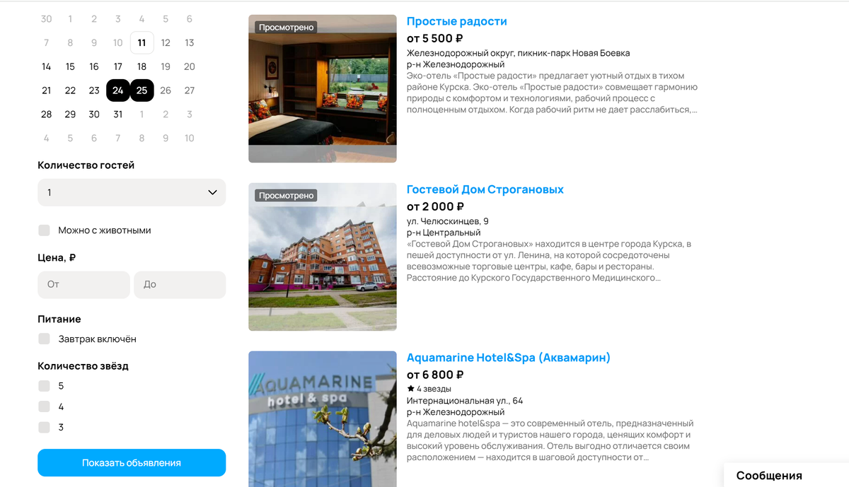В Курске на через «Авито Путешествия» предлагают 18 отелей, гостиниц, мини-отелей и хостелов. Есть бюджетные от 950 рублей за ночь: SMART Hotel KDO, NevSky, Гостевой Дом Строгановых и лакшери-варианты от 5000 рублей за ночт: Bed & Breakfast, «Престиж», Harten business & international и «Простые радости».