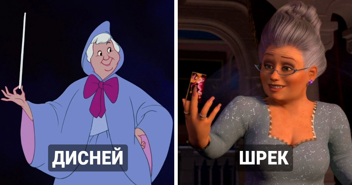 Мы растём вместе с героями сказок. Они с нами с самого детства, когда родители читают нам книги, или когда мы видим их в мульфильмах и кино. Создатели художественных произведений зачастую переосмысливают образы классических персонажей, добавляя им нечто авторское. Поэтому иногда герои не только имеют разную внешность, но и отличающиеся характеры. Мы сравнили, как выглядели сказочные персонажи в мире Диснея и в серии мультфильмов о Шреке. «Шрек» — произведение саркастичное, поэтому авторы не только поработали над образами знакомых нам персонажей, но и высмеяли многие клише. Создатели «Шрека» переосмыслили образ Феи-крёстной и превратили добрую помощницу в яркую и харизматичную злодейку. С Золушкой в этой киновселенной она уже не связана. А ещё нельзя не отметить, что она безумно похожа на сваху Розу Сябитову. Да, и тому самому волшебному зеркалу из сказки про Белоснежку в «Шреке» тоже место нашлось. Подобно Фее-крёстной, Рапунцель в «Шреке» тоже отрицательный персонаж, предавший своих п