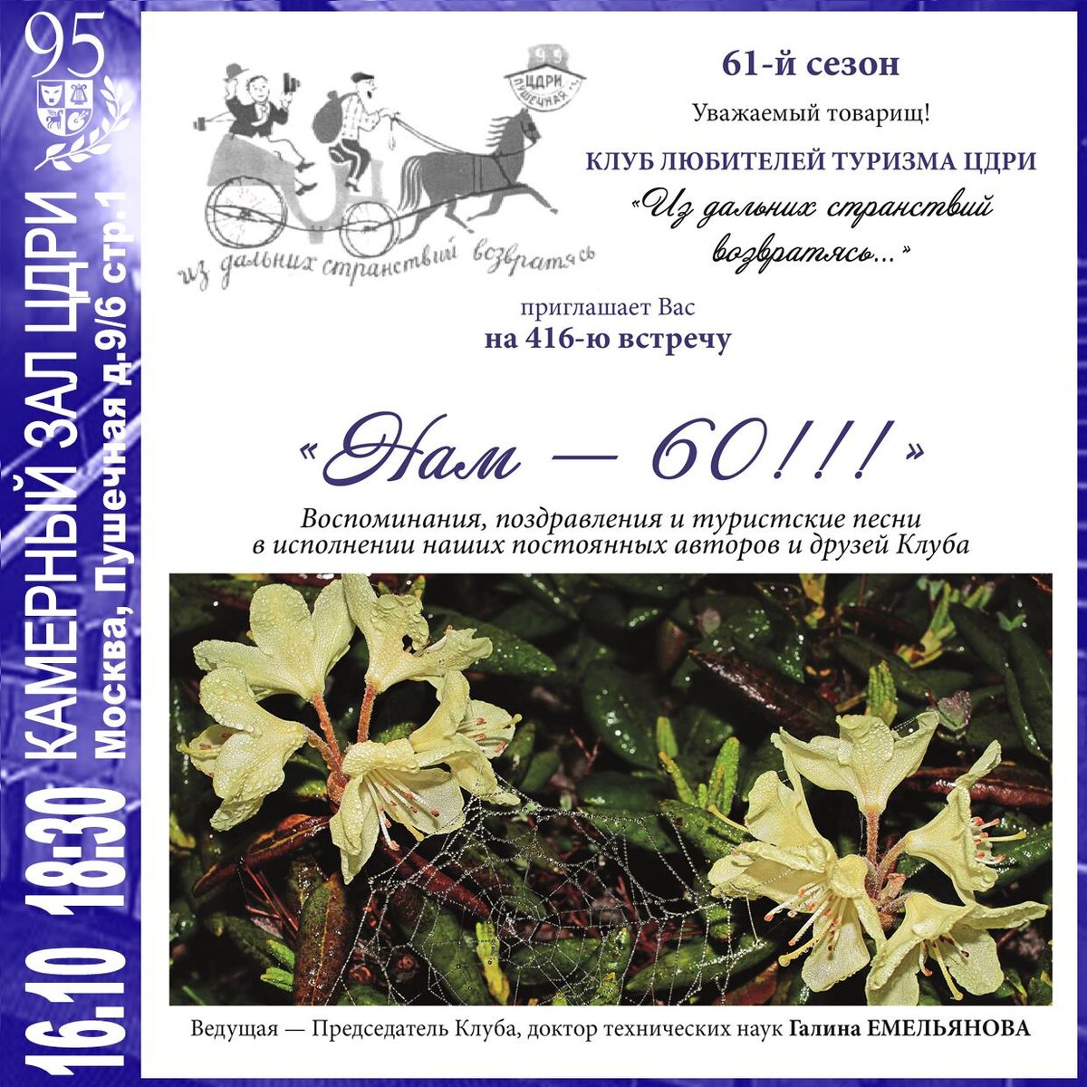 Клуб любителей туризма «Из дальних странствий возвратясь…» приглашает на 416-ю встречу Ведущая — Председатель Клуба, доктор технических наук Галина ЕМЕЛЬЯНОВА или в кассе ЦДРИ: г. Москва, ул. Пушечная 9/6 стр.1