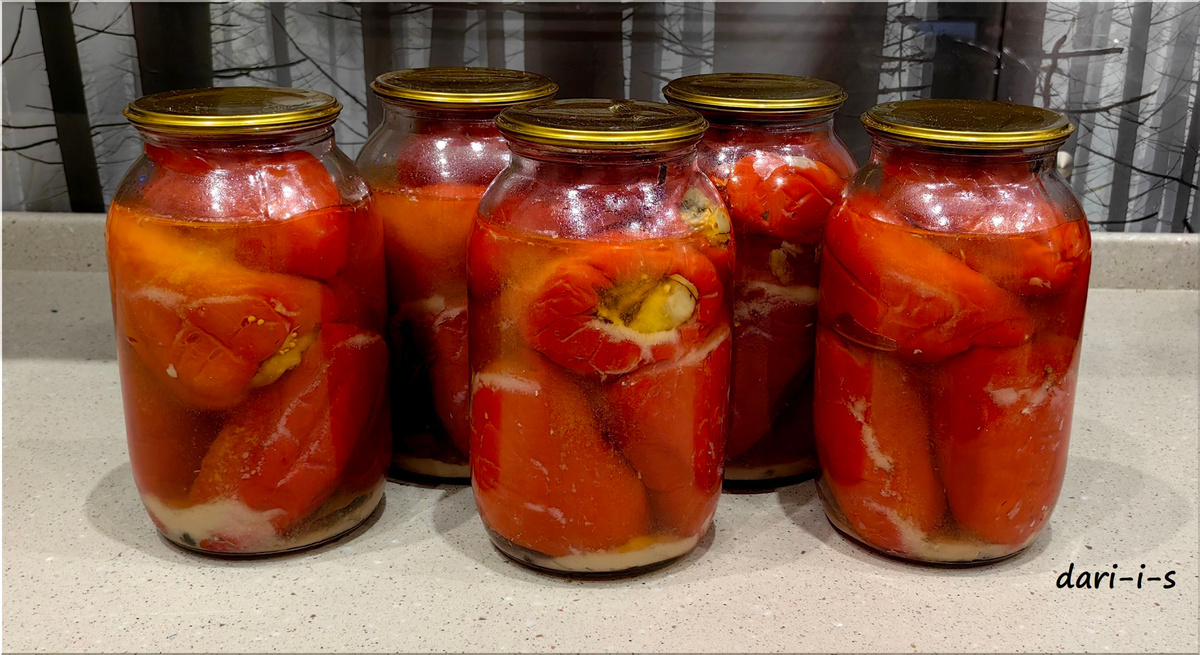 Скажу сразу: рецепт сложный. Но результат оправдывает каждую затраченную на него минуту! Это невероятно вкусное блюдо еще никого не оставляло равнодушным. Делаю каждый год, съедается все. Попробуйте сделать хотя бы небольшую порцию и, уверена, рецепт станет для Вас постоянным. Нам потребуются: Маринад: Я закрываю в банках объемом 1,5 л. Из указанного количества ингредиентов выходит ровно 10 таких банок. Овощи хорошо моем. Баклажаны очищаем от кожуры. Лучше покупать твёрдые, они легче чистятся, чем мягковатые. Нарезаем вдоль пластинами по 0,5 см толщиной. Обжариваем с двух сторон на растительном масле (я масло не жалею, так вкуснее). Выкладываем слоями на бумажные полотенца (в 2 слоя полотенца). В болгарском перце вырезаем аккуратно плодоножки и удаляем семена, оставляя сами перчины целыми. Дырку стараемся сделать поменьше. В большой кастрюле доводим воду до кипения. Кладём перец партиями в кипяток на 5 минут (между партиями снова доводим воду до кипения). Вынимаем шумовкой, оставляем с