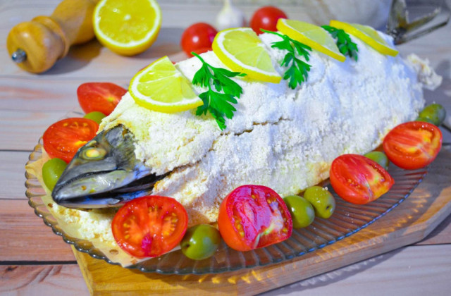 Готовьте с удовольствием, готовьте в удовольствие! Рецепт на 5 порций Ингредиенты: Скумбрия – 1 рыба среднего размера Пачка соли (1 кг) Яичный белок – 1 шт Раст. масло – 1 ст. л Лимон – 1 шт. Молотый перец, зелень петрушки – по вкусу Вода - 2 ст. л. Рыбу: разморозить, очистить, удалить жабры, потроха, плавники. Голову и хвост можно оставить. Подсушить салфетками. Соль: высыпать в подходящую посуду, перемешать с яичным белком и водой. Зелень: мелко нарезать, заправить маслом, лимонным соком. Противень: застелить фольгой, высыпать треть от подготовленной соли, положить сверху скумбрию, полить ее лимонным соком и поперчить - по вкусу. В брюшко рыбы положить зелень. Оставшейся солью укутать всю рыбу, оставив открытыми голову и хвостик. Духовку: разогреть до 200 - 220 градусов, положить в нее противень с рыбой. Время запекания 20 - 40 мин., более точное время и температура зависит от конкретной духовки. Когда достаем рыбу из духовки, соль должна быть твердой, разбиваем ее чем-нибудь острым