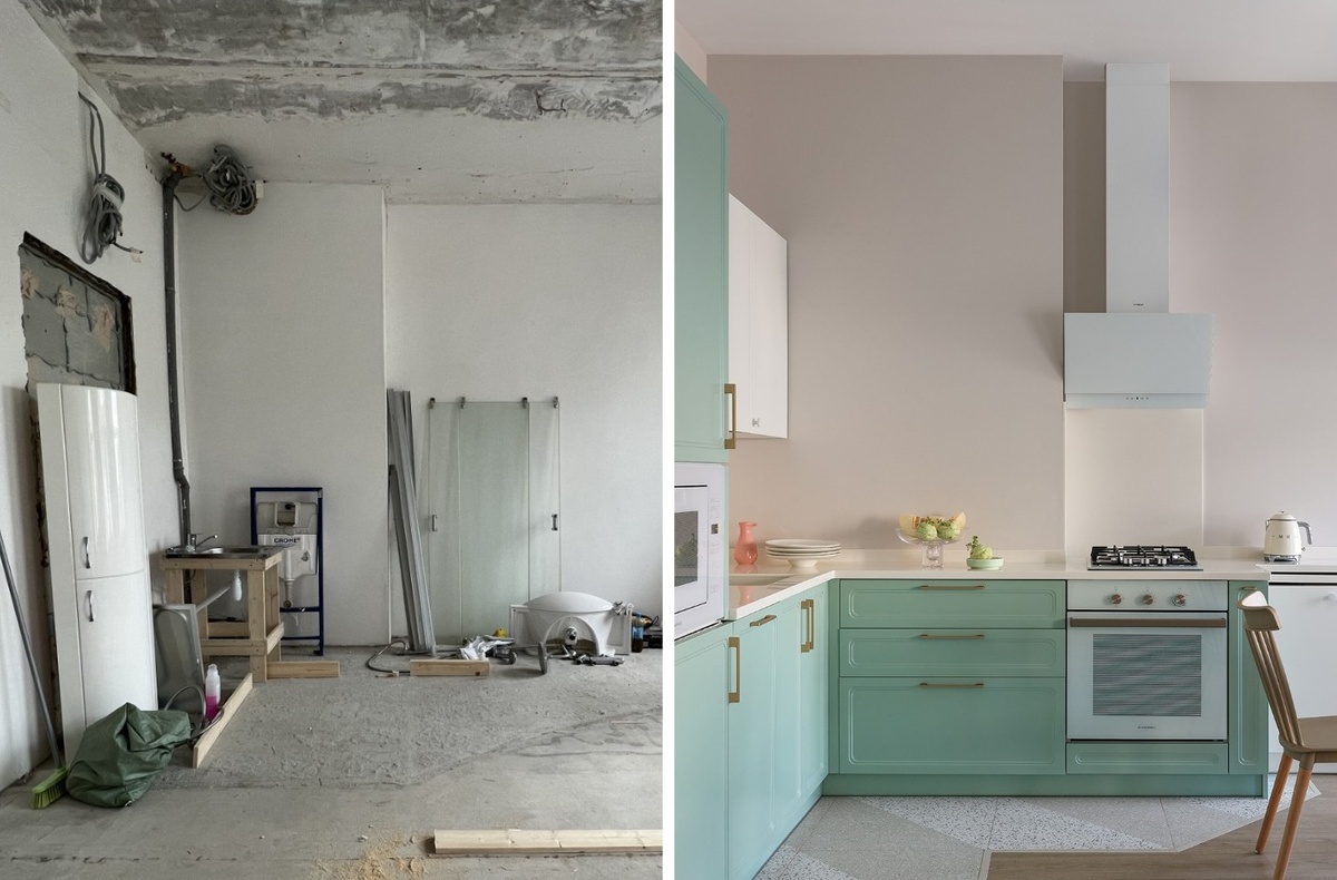 Эта квартира находится в доме 1890 года постройки. Заказчица купила ее на этапе демонтажа отделки. Прежние жильцы уже начали ремонт, но передумали. Квартира не нуждалась в перепланировке: большая кухня-гостиная, отдельная спальня, просторная прихожая и совмещенный санузел полностью устраивали новую владелицу. Дополнительный приятный бонус — все пять окон выходят на солнечную сторону, и из них открывается красивый вид.