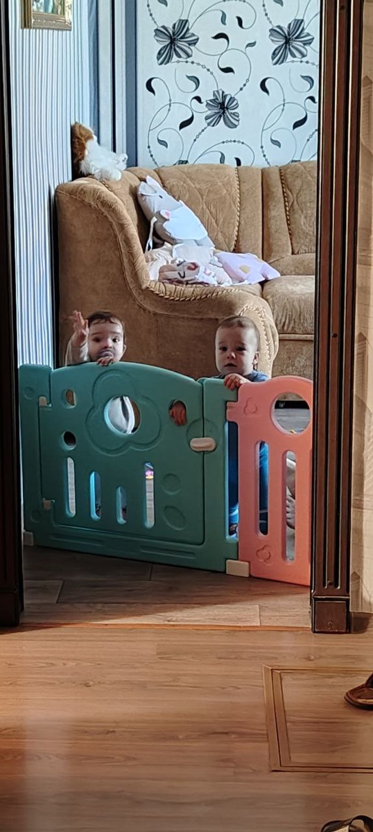 Доброго времени суток! Дедуля наш сегодня на работе. Хорошо сестра пришла с утра. Вчера не была, малыши уже соскучились. Радостно утром встречали ее, махали ручкой, звали. Если вести съемку с той стороны, где стояла сестра, получается прямо детки в клетке. Стоят, руками машут, на волю просятся. Как только она вошла, оба к ней на руки залезли, она не знала, что делать, каждый просил внимания. Потом Амелия решила пойти ко мне, ну и Севе сразу понадобилось пойти. Насиделись. Почитали книжки. Сестра читает Амелии сказку, Сева тоже берет книжку и громко "читает", внимание привлекает. Сева всегда привлекает к себе внимание всеми способами. Все должно быть его: и игрушки, и внимание. Как с этим бороться? Новая музыкальная книга уже такого интереса не вызвала, как первая. Немножко понажимают кнопки и бросают. Больше привлекают книжки-малышки. Их много, красочные. Листают, сказки нам рассказывают на своем только им понятном языке. Сева нашел пульт от телевизора старый, он тоже стал телефоном.