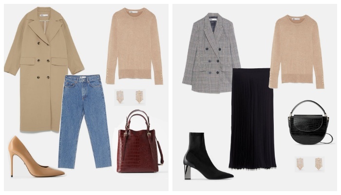 Возьмем предыдущий сет и заменим в нем белую рубашку на бежевый свитер, а лоферы на ботильоны — сразу же образ выглядит несколько иначе.