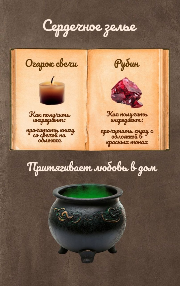 Наш марафон зельеварения продолжается.🎃 Обратимся ко второму рецепту. Итак🐾 Перед нами сердечное зелье, притягивающее любовь. Необходимые ингредиенты: 👉Огарок свечи 👉Рубин Чтобы сварить зелье, нужно найти книгу, на обложке которой присутствует нужный ингредиент.✨ 📚Я выбрала две книги небольшого объема т.к. горка начатых книг уже и так выше меня. Читаем, варим, рассказываем о результатах. Скоро третий финальный рецепт.❤️