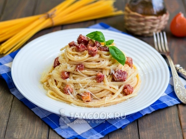 - Бекон порезать квадратиками, вытопить жир, добавить макароны.