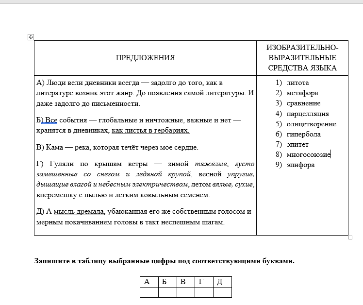 Обновлены мои пособия по подготовке к ЕГЭ в соответствии с демоверсией 2025. Покажу, что я насочиняла для оставшихся вариантов в плане средств выразительности. Для варианта "Тотальный диктант", естественно, брала предложения из текстов ТД разных лет. Получилось так: Задание 22. Установите соответствие между предложениями и названиями изобразительно-выразительных средств языка, которые употреблены в них: к каждой позиции первого столбца подберите соответствующую позицию из второго столбца. ПРЕДЛОЖЕНИЯ А) Люди вели дневники всегда — задолго до того, как в литературе возник этот жанр. До появления самой литературы. И даже задолго до письменности. Б) Все события — глобальные и ничтожные, важные и нет — хранятся в дневниках, как листья в гербариях. В) Кама — река, которая течёт через мое сердце. Г) Гуляли по крышам ветры — зимой тяжёлые, густо замешенные со снегом и ледяной крупой, весной упругие, дышащие влагой и небесным электричеством, летом вялые, сухие, вперемешку с пылью и легким ковы