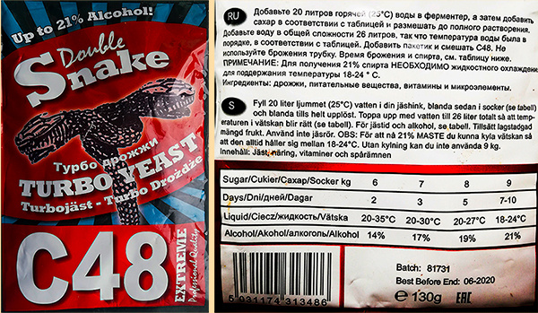 Дрожжи Double Snake C48 это спиртовые турбо дрожжи. Максимальная крепость сбраживания 21℅. Дрожжи при брожении выделяют фруктовый аромат и поэтому подойдут для тех кто делает ароматную брагу или борется с запахом браги в помещении. Дрожжи Double Snake C48 это спиртовые турбо дрожжи, соответствующие качеству спиртовых дрожжей, быстро бродят, не пенятся. Максимальная крепость сбраживания 21℅, это гидромодуль 1:2.2. Гидромодуль 1:2.2, это 1 кг сахара и 2.2 литра воды. Гидромодуль 1:2.2 это экстремальный гидромодуль для этих дрожжей. Максимальная рабочая крепость на дрожжах Double Snake C48, это 19℅, гидромодуль 1:2.5. Оптимальная крепость на этих дрожжах, это 17℅, гидромодуль 1:3. При этом гидромодуле дрожжи быстро бродят и набраживают достаточно спирта. Можно пойти в сторону увеличения крепости, и выбрать гидромодуль между 1:3 и 1.2.5, но тогда увеличится время брожения. Вам выбирать между скоростью брожения и крепость браги. Чем крепче брага, тем больше выход спирт сырца при перегонке