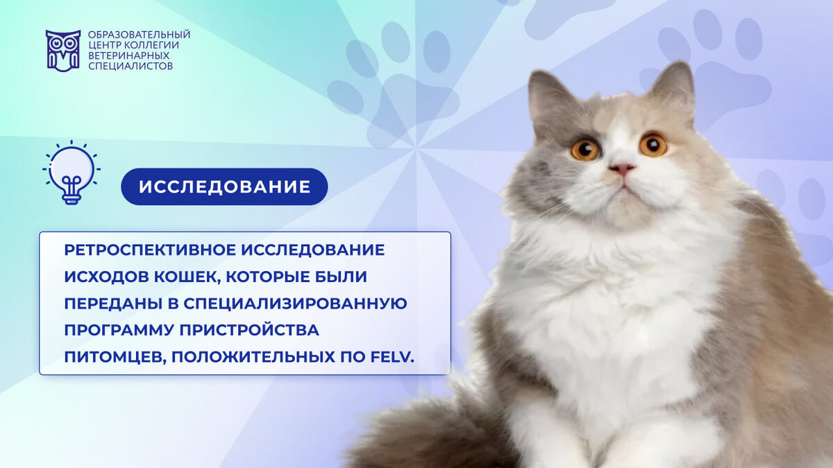 В этот раз мы хотим поделиться исследованием, которое касается вируса лейкоза кошек. 🔸Зачем его проводили? Целью данного ретроспективного исследования было оценить исходы кошек, которые были переданы в специализированную программу пристройства питомцев, положительных по FeLV. 🔸Как много пациентов участвовало в исследовании? 801 кошка всевозможных пород с подозрением на заражение FeLV. 🔸Как проводили исследование? Ретроспективно изучили истории болезни питомцев, которые были направлены в программу пристройства кошек с вирусом лейкоза кошек в период с января 2018 года по июль 2019 года в приюте для животных в Остине, штат Техас, США. Пациенты были направлены от приютов, волонтерских групп, ветеринарных врачей или частных лиц с предполагаемым диагнозом FeLV. При поступлении каждая кошка была повторно проверена на вирус лейкоза кошек и в последствии была признана инфицированной или неинфицированной. Данные о происхождении пациента, дате поступления, дате регистрации исхода, типе исхода,
