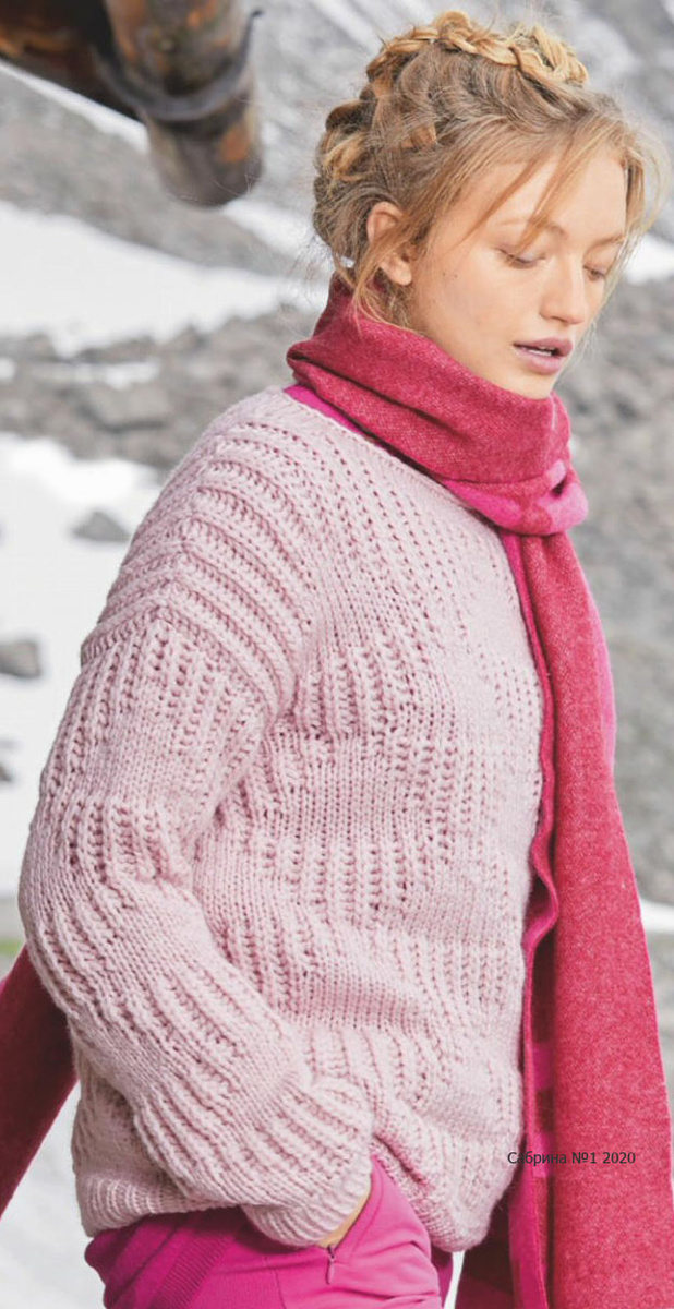 От белого до ярко-розового и сиреневого - чудесная меланжевая пряжа красиво оттеняет разнообразные рельефные структуры этого замысловатого пуловера.