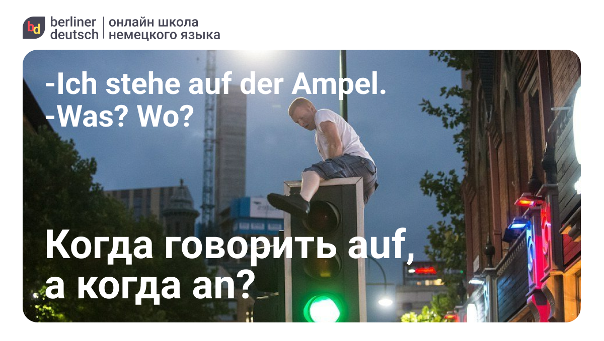 Если вы скажете немцу «Ich stehe auf der Ampel», то он вас не поймет и подумает, что вы, вероятно, сошли с ума и находитесь прямо сверху светофора. Поэтому давайте разберёмся, как же правильно использовать эти предлоги!