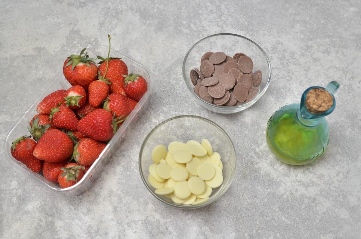 ШАГ 1: Как сделать клубнику в шоколаде? Подготовьте продукты. Клубнику возьмите свежую, крупную, всех вкуснее десерт получится из сезонных ароматных ягод. Шоколад подойдет в любом виде — плиточный, в каплях или монетках, как у меня. Я использовала молочный и белый, отлично получится с темным и горьким, но это уже на любителя. Главное, чтобы он был натуральным и качественным. Масло возьмите обязательно без запаха, чтобы оно не чувствовалось в глазури. ШАГ 2: Клубнику промойте под проточной холодной водой прямо в дуршлаге. Оставьте ягоды в нем же, чтобы стекла лишняя жидкость. Хвостики не отрывайте, за них будет удобно держать десерт при поедании. ШАГ 3: Затем разложите клубнику сохнуть на бумажное полотенце. Дополнительно оботрите каждую ягоду — лишняя влага помешает шоколаду покрыть клубнику равномерно. Разложите сухие ягоды на тарелку в один слой и уберите минут на 10-15 в морозилку — на охлажденных ягодах шоколадная глазурь застынет быстрее и не стечет. ШАГ 4: Растопите шоколад. Это