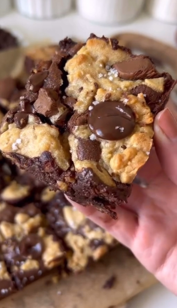 Ингредиенты : Ссылка на видео рецепт Для Брауни: • 3 яйца • 230 гр сахара • 100 гр муки • 2 ст. л не сладкого какао • 170 гр сливочного масла • 200 гр темного шоколада Тесто для печенья: • 115 гр растопленного сливочного масла • 230 гр муки • 1 яйцо • 1 ст. л ванили ( по вкусу) • 165 гр светло- коричневого сахара • 120гр шоколадной крошки Приготовление: Брауни растопить масло и шоколад. Взбить яйца с сахаром, затем добавить растопленный шоколад. Добавить муки и какао, все перемешать лопаткой Тесто для печенья Смешать растопленное сливочное масло с сахаром. Добавить ваниль, яйцо и муку. Затем добавьте шоколадную крошку. Сбор: тесто для брауни влейте в форму 25 см. Кусочками положите тесто для печенья на брауни. Выпекайте при температуре 190 градусов 25-30 минут. Bon Appétit 🍪