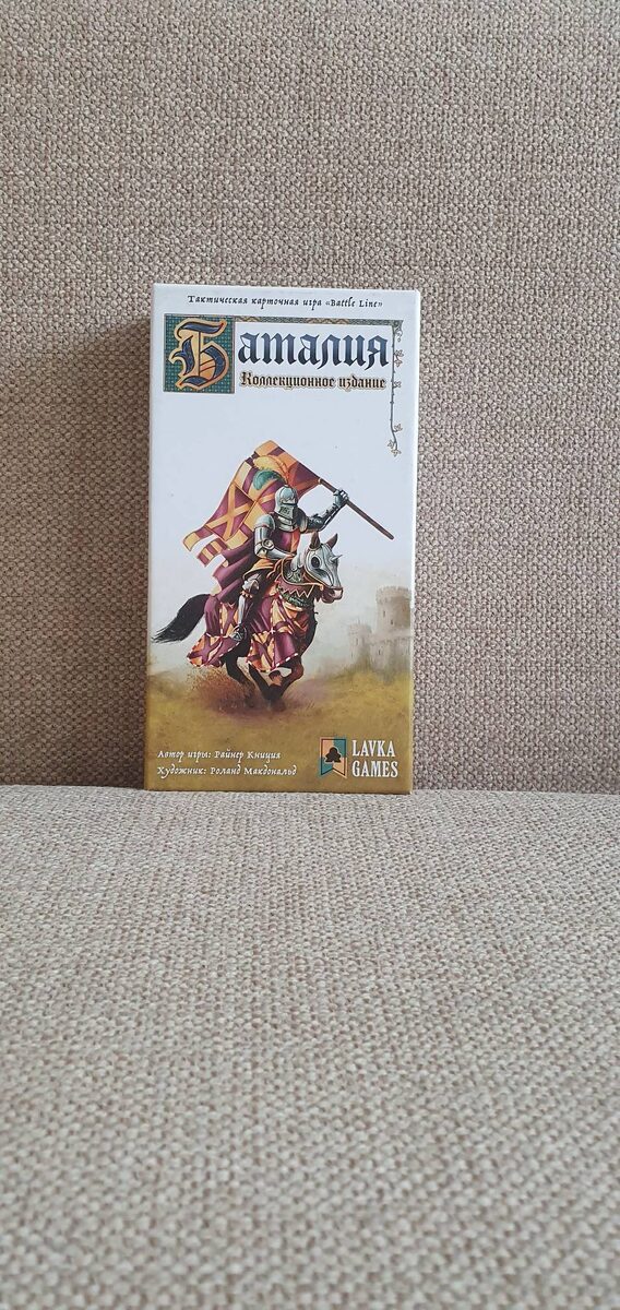 Сегодня мы рассмотрим настольную игру Райнера Книция- "Баталия". В состав игры входят: 10 карт тактики, 60 карт отрядов ( карты шести цветов с числами от 1 до 10), 9 карт полей битвы. ОПИСАНИЕ ПРАВИЛ: В начале игры каждый игрок получает по 7 числовых карт и в свой ход может сыграть одну из них на поле боя. На каждой локации по умолчанию может быть только 3 карты отрядов. Отряды можно играть на любые поля битвы, но желательно организовывать их в построения-наборы карт по цветам и числам. Самое мощное и сложное построение- клин. Клин- три последовательных числа одного цвета. За ним идёт каре и колонна- три одинаковых числа и три карты одного цвета соответственно. Цель игры- захватить три соседние локации или пять любых. Если один из игроков создаёт построение на одном из полей, и если другой игрок теоретически не может его "перебить"(выложить более мощное построение)- тот везунчик захватывает карточку. На захваченную локацию больше нельзя играть карты тактики и отрядов. В конце хода иг