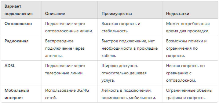 В современном мире интернет является неотъемлемой частью бизнеса, особенно для офисов, заводов, складов и пунктов выдачи заказов. Наличие стабильного и быстрого интернета позволяет компаниям эффективно работать, поддерживать связь с клиентами и партнерами, а также обеспечивать надежное выполнение бизнес-процессов. В этой статье мы расскажем, как провести интернет в офис дешево, какие варианты подключения существуют, а также представим сравнительные данные по разным технологиям. Автор: Иван Миронов - генеральный директор компании ONnet Телеком, предоставляющей услуги подключения интернета по оптоволокну и радиоканалу для физических и юридических лиц. Современный бизнес требует высокой скорости передачи данных. По данным исследования Statista, более 70% компаний отмечают, что высокая скорость интернета значительно увеличивает их продуктивность. Кроме того, качественный интернет важен для: Для подключения интернета в офис существуют несколько основных вариантов. Рассмотрим их подробнее.