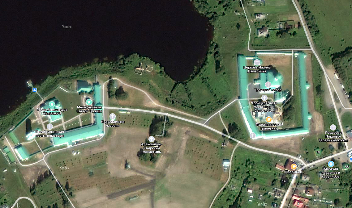 Экскурсию по Александро-Свирскому монастырю начнём с Троицкой части. На северо-западе Троицкого комплекса находится церковь Иоанна Дамаскина, в центре – Троицкий собор и звонница, в юго-западной части – Покровская церковь.