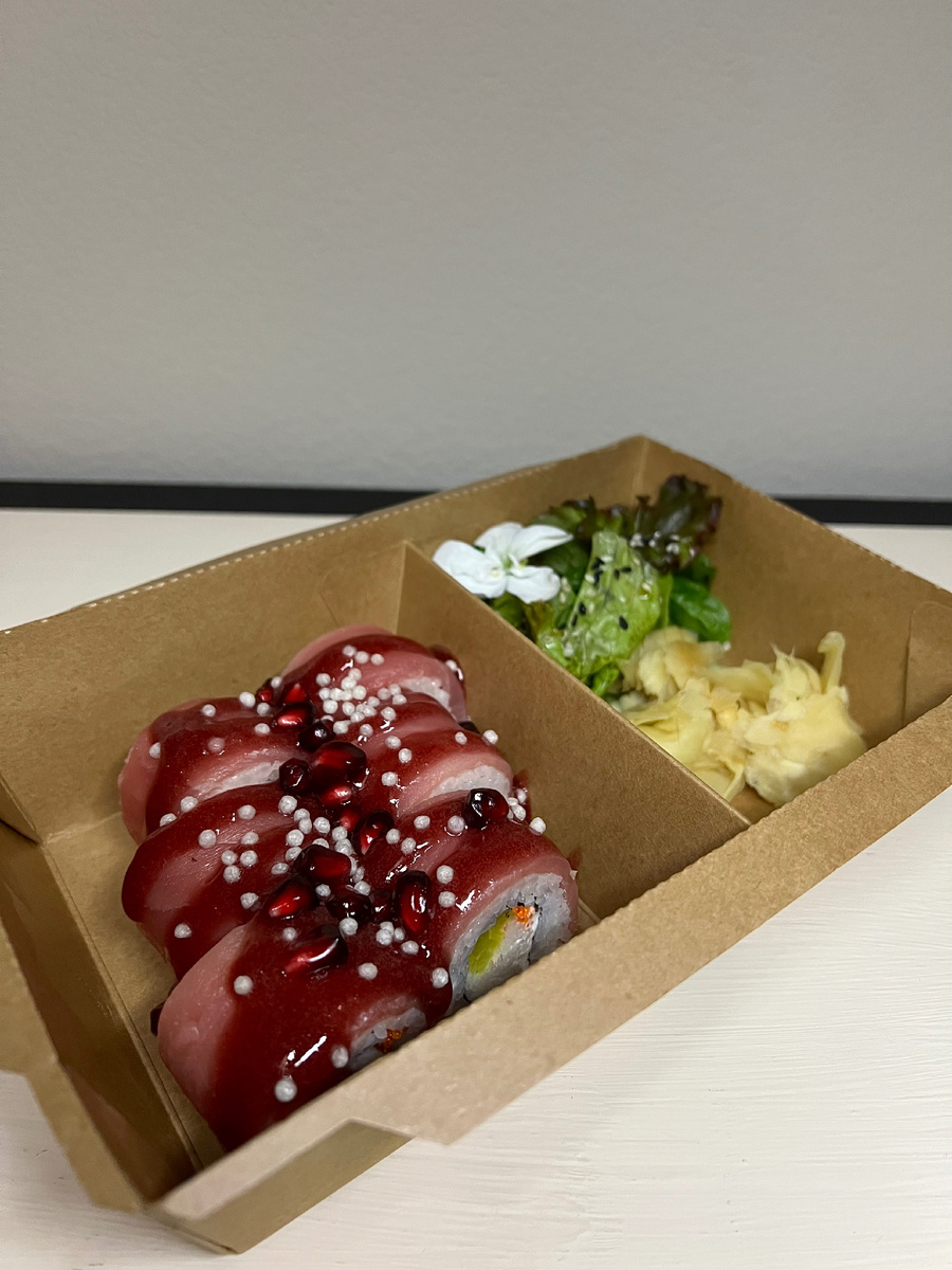 Креативно! Вкусно! Ярко! Уникальные авторские роллы, таких вкусовых сочетаний вы нигде не встречали. Ролл с тунцом и гранатовым соусом (720 р) Один из моих фаворитов ♥️ Яркий кисло-сладкий гранат, нежный тунец, и хрустящий такуан. Ролл темпура, с креветками и трюфельным тунцом и шиитаке (720 р). Мега хрустящая темпура, огромные роллы. Мужу понравился, мне не очень. Ролл Апероль (690 р) - не понравился, тунец, рис, творожный сыр и апельсин полное баловство с продуктами. Ролл с креветкой и соусом из халапеньо (650 р) - острый, дерзкий. Идеально для фанатов хрена и васаби. Выглядит конечно как домовенок Кузя из советского мультика, но ролл вкусный! Ролл лосось и манговый соус (790 р) Этот ролл мой фаворит ❤️ Нежный лосось и офигенный тайский манговый соус, райское наслаждение. ✅Место однозначно заслуживает вашего внимания. Правда некоторые позиции показались баловством. Классика — это вкусно, но порой очень предсказуемо, иногда можно и соскучиться. Не бойтесь экспериментов! Идит