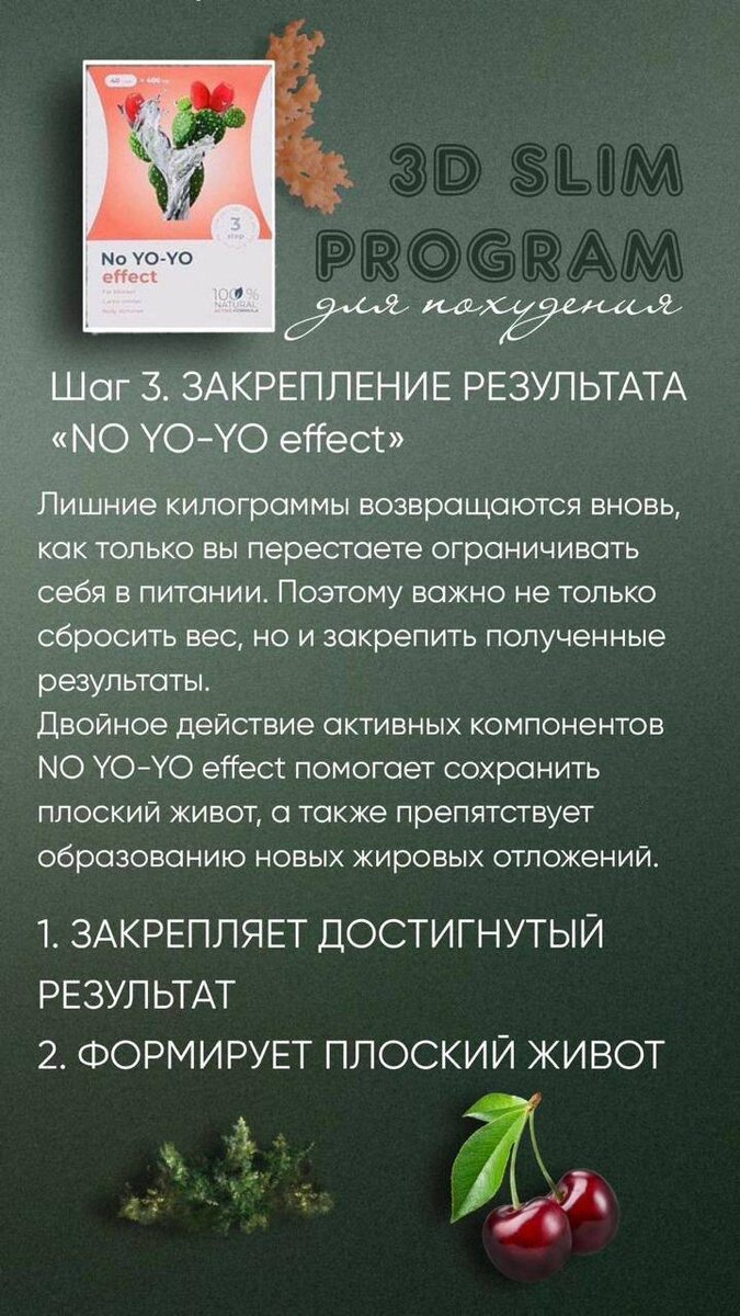 effect 3️⃣ ШАГ - ЗАКРЕПЛЕНИЕ РЕЗУЛЬТАТА «NO YO-YO effect» Лишние килограммы возвращаются вновь, как только вы перестаете ограничивать себя в питании (Йо-йо эффект). Поэтому важно не только сбросить вес, но и закрепить полученные результаты. Двойное действие активных компонентов NO YO-YO effect помогает сохранить плоский живот, а также препятствует образованию новых жировых отложений.