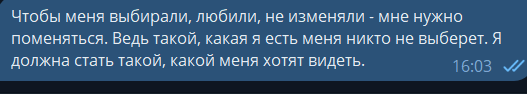 Руфус Уэйнрайт: "Секрет счастья в том, чтобы быть собой." Села на диету, не задаю лишних вопросов, чтобы быть "легкой" женщиной и все равно все не так, все ни то. Бывало ли в вашей жизни, что вы стремились угодить партнеру снова и снова, раз за разом, теряя свою индивидуальность? Боялись ли вы, что если покажете свою истинную сущность, то вас отвергнут или осудят? Если ваш ответ да, то у вас наверняка есть несколько "масок", которые вы надеваете, чтобы защитить себя от боли отвержения. Надеваете эти "маски", потому что боитесь быть собой в отношениях, потому что отношения для вас ценны и значимы, но нет уверенности, что вас выберут. Надеваете "маски" из благих намерений, чтобы быть ближе, чтобы нравиться, "держите лицо", хотите, но молчите, а то "подумают еще"... Тогда вы наверняка прилагаете усилия, чтобы скрыть свою истинные эмоции "нет нет, я не злюсь на тебя, я радуюсь", скрыть истинные потребности, желания. Но ведь и партнеру в таком случае приходится прилагать усилия, чтобы угада