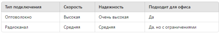 Для офиса оптимально подходит оптоволоконное подключение, которое обеспечивает высокую скорость и стабильность.
