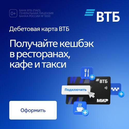 💸 Банк ВТБ дарит 1000₽ новым клиентам. Оформите дебетовую карту, совершите первую покупку и получите бонус на счет. Переходите по ссылке и выпускайте дебетовую карту от банка ВТБ с вечным бесплатным обслуживанием и кэшбэком в рублях до 30%. По карте будут действовать: — Бесплатные переводы в другие банки — 0₽ комиссии по обязательным платежам (штрафы, ЖКХ, интернет) — Постоянный кэшбэк 2% в супермаркетах, ресторанах и барах, такси и транспорте + до 30% кэшбэка за покупки у партнеров. Также карта работает в 8 странах, путешествуйте без стресса. 🎚️ Оформить дебетовую карту ВТБ бесплатно: оформить карту