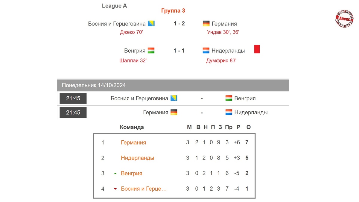 Футбол. Лига Наций УЕФА. 3 тур. Результаты 11 октября. Расписание, таблицы.