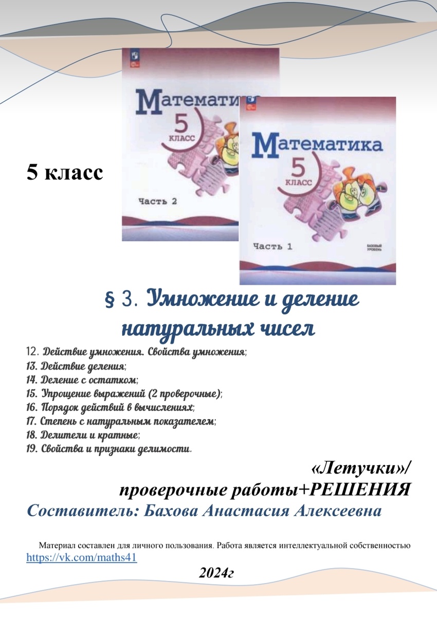5 класс, "ЛЕТУЧКИ" §3." Умножение и деление натуральных чисел " + ОТВЕТЫ /решения Готовы " ЛЕТУЧКИ" для всего 3§ 5 класса (Виленкин)📢 12. Действие умножения. Свойства умножения; 13. Действие деления; 14. Деление с остатком; 15. Упрощение выражений (2 работы); 16. Порядок действий в вычислениях; 17. Степень с натуральным показателем; 18. Делители и кратные; 19. Свойства и признаки делимости. По 2 варианта. 9 проверочных работ. Что такое "ЛЕТУЧКИ"?! Это быстрые проверочные работы, которые позволяют: ✏️проверить базовые знания учащихся по теме/ быстро оценить готовность ученика к уроку; ✏️не тратить много времени на проверку знаний; ✏️накопить хорошее количество отметок за четверть; ✏️быстро проверить данные работы, так как все варианты идут с решениями⌛ Как с ними работать?! 📍Материл можно использовать на втором уроке после новой темы(можно и на первом): в начале урока/в середине/в конце. На Ваше усмотрение; 📍Проверочные рассчитаны на 3-7 мин. Если нужно точно определить время