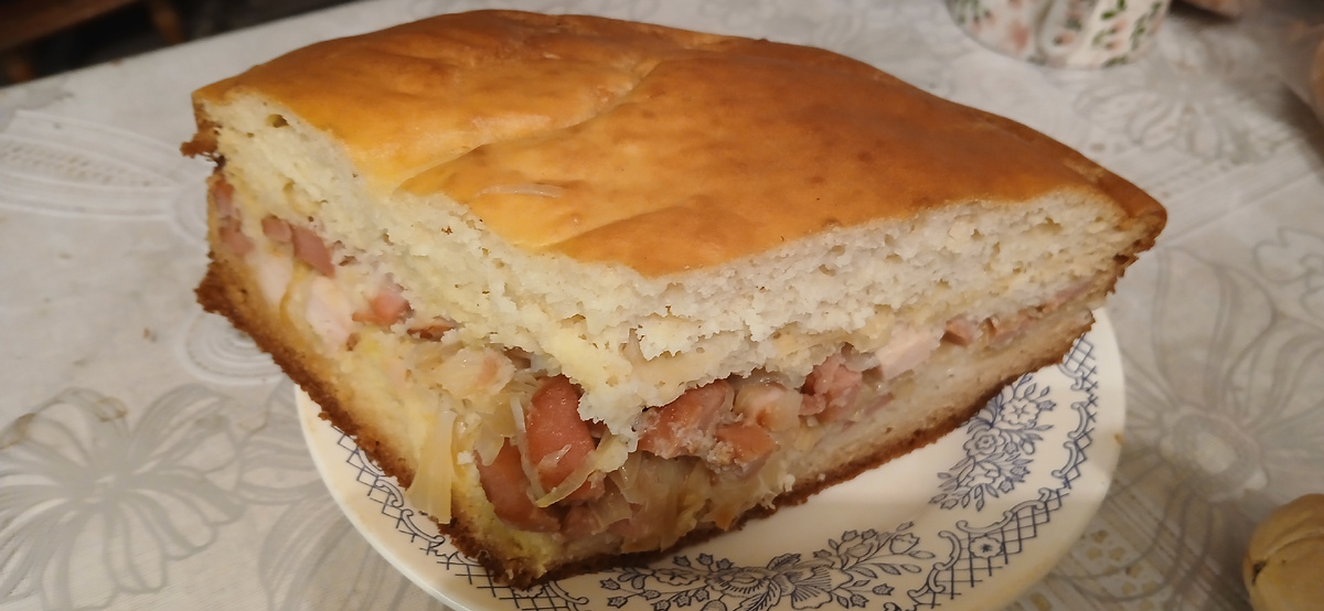 Рецептов этого пирога два. Один готовится на основе кефира, второй на майонезе и сметане. Мне больше нравится тот, что на кефире. Для заливного пирога нам понадобится: для теста : Начинку вы можете приготовить разную, это может быть рыба , рис , яйцо или мясной фарш, всё, что нравится вам и вашим домашним. Мы приготовим начинку из капусты и сосисок. Для начинки нам понадобится примерно 400 г. капусты и несколько сосисок, на ваше усмотрение. Для начала нужно приготовить начинку. Капусту нужно нашинковать, сосиски порезать в произвольной форме. Я советую вам сосиски слегка поджарить. Тогда у них появится ярко выраженный вкус копчения. Нашинкованную капусту слегка поджариваем, на растительном масле, до состояния мягкости, не забывая её подсолить. Затем, оба наших ингредиента, смешиваем. Начинка готова ! Даем ей немного остыть, а в это время начинаем делать тесто. Для приготовления теста : взбиваем яйца до однородности, добавляем в них кефир, растительное масло и еще немного перемеши