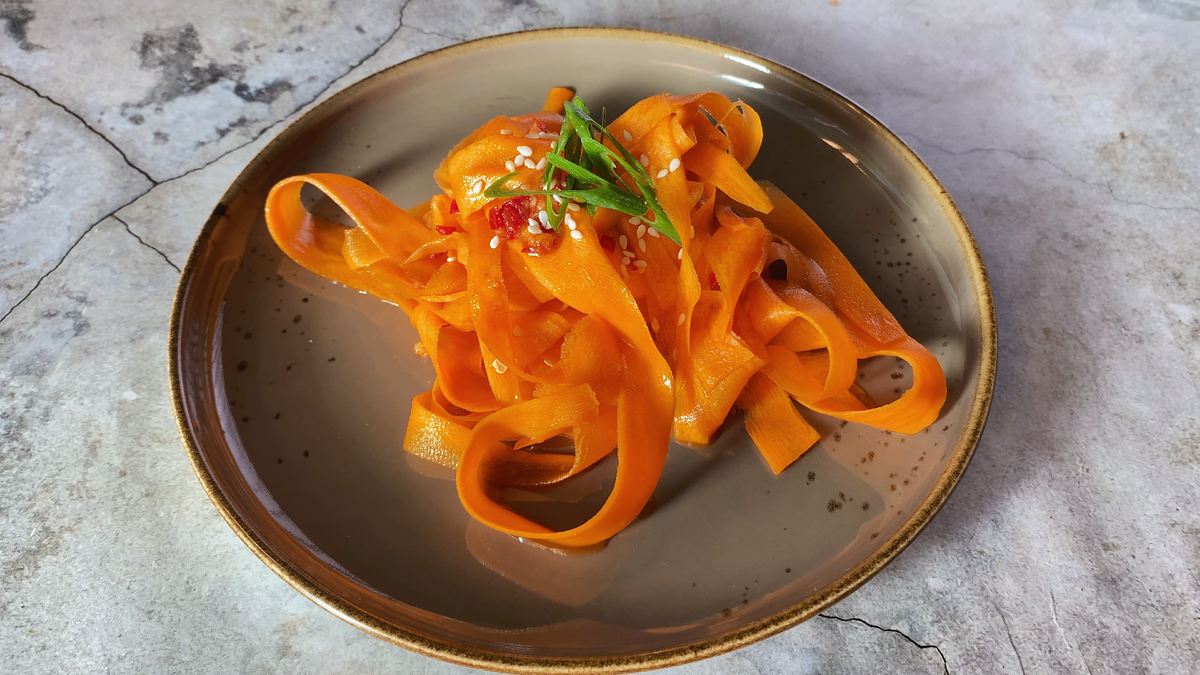 Предлагаю вам простой рецепт острого салатика (если его можно так назвать) из моркови в азиатском стиле. Он подойдёт в качестве лёгкой закуски или гарнира к основному блюду. Готовится совсем несложно, а все ингредиенты, скорее всего, уже есть у вас на кухне! Морковь нарезается тонкими ломтиками с помощью овощечистки, заправляется смесью специй и масел, и маринуется буквально 10-15 минут. В результате она обретает приятную остроту и насыщенный вкус. Эта закуска не только вкусная, но и безвредная для вашей талии! Отлично подходит для тех, кто следит за своим весом и питанием. Что важно — обратите внимание на нарезку. Слайсы должны быть достаточно тонкими, чтобы лучше и максимально быстро пропитаться заправкой (при этом они остаются хрустящими). Если вы не фанат острого, то я рекомендую не борщить с перцем и чесноком: пусть вкус моркови остается главным, а острота только подчеркивает его. 1. Очистите морковь и отрежьте кончики. С помощью овощечистки нарежьте морковь длинными тонкими ломти