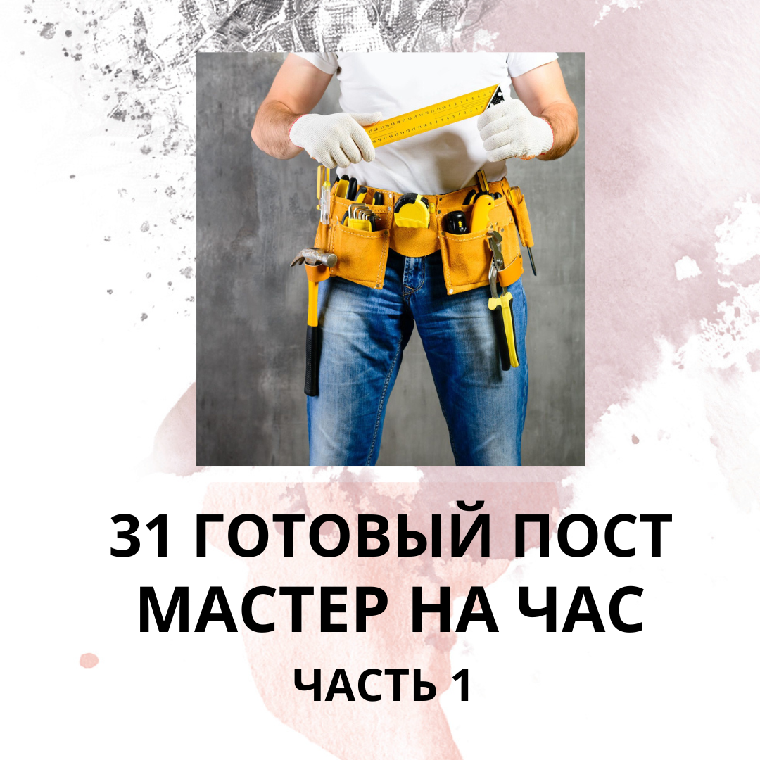 В поисках готовых постов для своих социальных сетей? Мы подготовили для Вас 31 Готовый пост, который Вы сможете использовать в своих социальных сетях для привлечения новых клиентов. Купить посты на тему "Мастер на час" можете по ссылке: Темы постов: 1. Зачем нужны услуги мастера на час, если можно попробовать самому? 2.Как быстро починить сломавшийся стул: советы мастера на час 3.В чем преимущества заказа мастера на час для мелких бытовых задач? 4.Сломалась полка? Не беда! Мы все исправим за час 5. Когда пора вызывать мастера, а не пытаться починить самому? 6.Мастер на час: экономим ваше время и нервы! 7.Как выбрать надежного мастера для мелкого ремонта дома? 8.Нужен мастер на час? Почему это выгоднее, чем самому браться за дело! 9.Полезные лайфхаки от мастера на час для быстрого ремонта 10.5 случаев, когда мастер на час спасет ваш день! 11.У вас отклеилась плитка? Доверьте это мастеру, а сами отдохните! 12.Почему мелкие ремонты важно доверить профессионалу? 13.Секреты мастера на час: