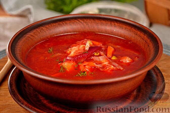 Этот борщ готовится с квашеной капустой и зелёным горошком. Кислинка капусты идеально уравновешивается сладостью горошка, создавая яркое и запоминающееся сочетание. Сытно даже без мяса. Продукты Свёкла - 330 г (1 шт.)Капуста белокочанная - 250 гКапуста квашеная - 200 гГорошек зелёный замороженный - 100 гКартофель - 250 г (3 шт.)Морковь - 190 г (1 шт.)Лук репчатый - 130 г (1 шт.)Чеснок - 10 гТоматная паста - 70 гЛавровый лист - 2 шт.Масло растительное - 45 мл (3 ст. ложки)Перец душистый горошком - 3-4 шт.Перец чёрный молотый - 1/8 ч. ложкиСоль - 1 ч. ложкаУкроп свежий - 3 веточкиВода - 1,5-2 л Подготавливаем все необходимые продукты. Разогреваем духовку до 180-190 градусов. Свёклу вымываем, заворачиваем в фольгу и запекаем в духовке 40-60 минут. Морковь очищаем и нарезаем брусочками. Картофель и лук очищаем. Картофель нарезаем средними кубиками, а лук - четвертькольцами. Чеснок и зелень измельчаем. Капусту шинкуем соломкой. В кастрюле разогреваем растительное масло. Обжаривае