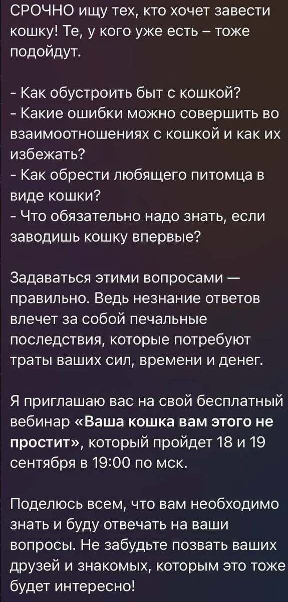 Пока многие работают на 2-х работах чтобы как то обеспечить свою семью, инфобизы придумывают новые способы заработка. Встречайте "Ваша кошка вам этого не простит", вебинар бесплатный, но там будут продавать планый по отношению с кошкой 😆.