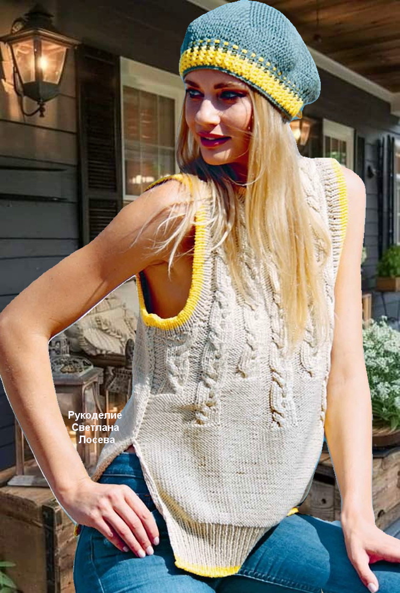Этот вязаный жилет связан спицами с использованием рельефных кос из пряжи бежевого цвета. В отделке жилета так же присутствует жёлтая окантовка по проймам и низу, что добавляет изделию изысканности и шарма.